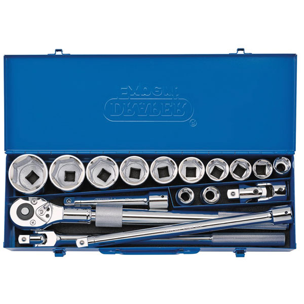 Expert Quality, six point sockets made from chrome vanadium steel that's hardened and tempered with a polished finish. Supplied with an extending reversible ratchet. Each socket has a knurled ring for extra grip. Packed in a steel carrying case.