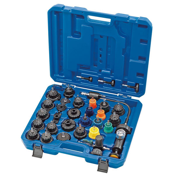 Expert Quality, for pressure testing radiators of most popular vehicles. Will also pressure test radiator caps for leakage. 33 colour coded adaptors allow direct connection to radiator or expansion tank. Hand pump with gauge graduated with bar and PSI allows simple and easy controlled pressurization via a quick coupling system. Pressure release pin allows system to be depressurized prior to detachment. Supplied in carrying case with display sleeve.
