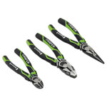 This green and black three-piece plier set contains a 160mm side cutter, 180mm combination pliers and 200mm long nose pliers.