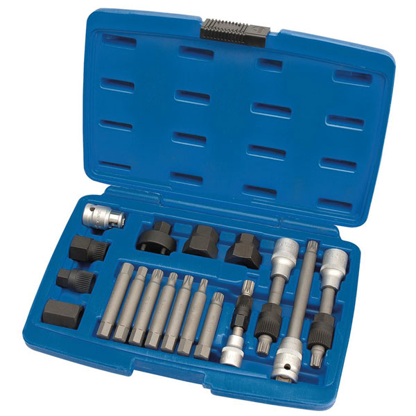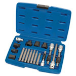 Expert Quality, for removing alternator freewheels. The comprehensive kit can be used on popular European car marques either on or off the engine. Packed in blow mould case with display sleeve.