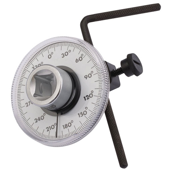 Expert Quality, designed to be used with any 1/2" sq. drive torque wrench. Rotating index line allows operator to accurately tighten fixing to manufacturer's exact angular specification. Clearly printed in 2 degree increments, then 10 degree movements and numbered every 30 degrees around the full 360°. Supplied with fully adjustable reaction arm. Display packed.