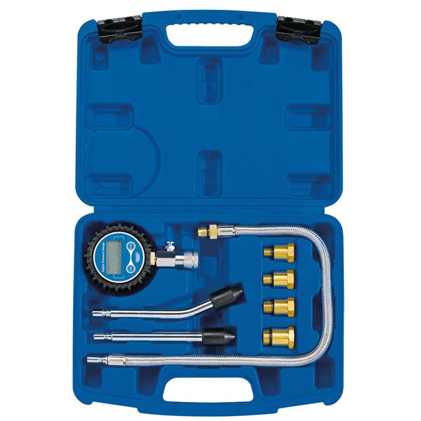 Expert Quality, compatible with direct and indirect petrol engines which use 10, 12, 14 and 18mm spark plug threads. Attached with a digital LCD display gauge with a choice of three pressure scales 0 - 300psi/0 - 20bar/0 - 2000kPa and fitted with a heavy - duty rubber protector. The braided stainless steel hose improves durability. Fitted with a spring - loaded pressure relief valve and integrated Schrader one - way valve system. Supplied in a plastic storage case.