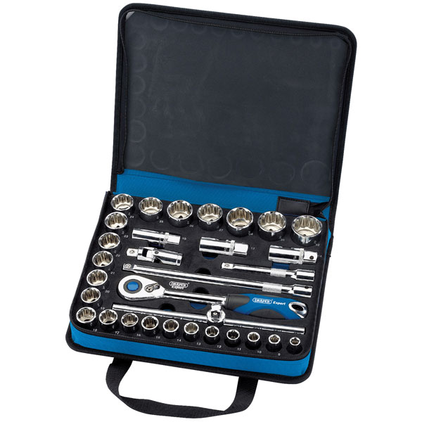 Expert Quality, chrome vanadium steel hardened, tempered, chrome plated and polished for corrosion protection. Sockets have knurled ring for extra grip. Packed in handy zip carrying case with web strap handles and quality foam insert. Display packed.