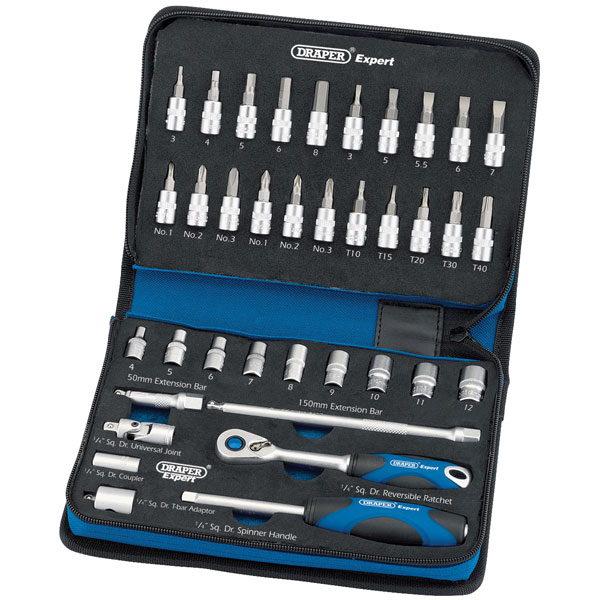 Expert Quality, chrome vanadium steel hardened, tempered and satin chrome plated for corrosion protection. Sockets have knurled ring for extra grip. Packed in handy zip carrying case with foam insert, web strap handles and display sleeve.