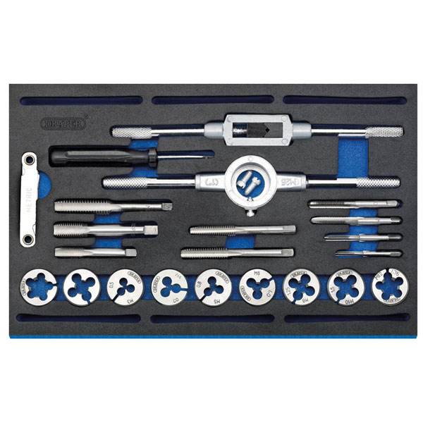 Expert Quality, manufactured from carbon steel. Taps and dies suitable for cleaning and cutting threads on mild steel and alu Minium. Supplied complete in a two tone 1/4 drawer EVA insert tray made from closed cell foam, suitable to be used in Draper and Draper Expert tool chests and other manufacturers similar tool chests.