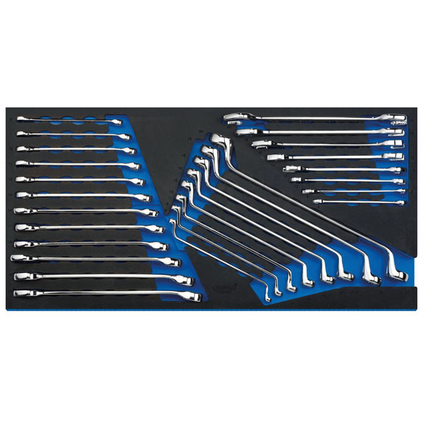 Expert Quality, selection of ring and open ended spanners manufactured from chrome vanadium steel which is correctly hardened, tempered and then fully polished. Supplied complete in a two tone full drawer EVA insert tray made from closed cell foam. Suitable to be used in Draper and Draper Expert tool chests and other manufacturers similar tool chests.