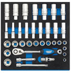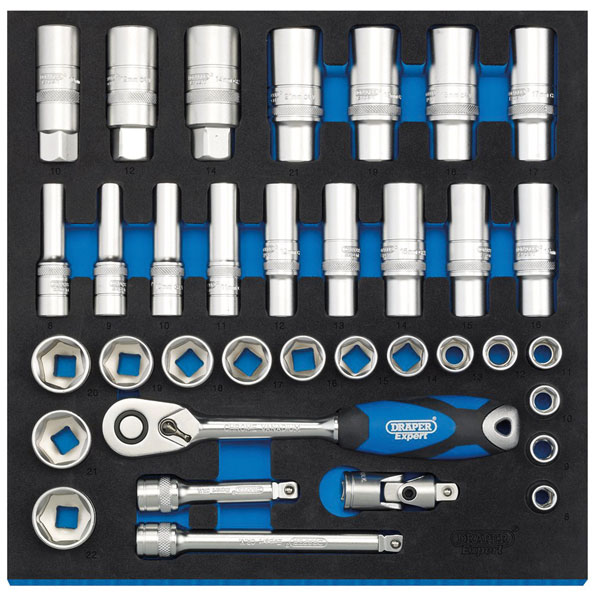 Expert Quality, sockets are manufactured from chrome vanadium steel, which is correctly hardened and tempered with a micro satin chrome plated finish. Each socket has a knurled ring for extra grip. Supplied with 72 tooth reversible soft grip ratchet and accessories. Supplied complete in a two tone 1/2 drawer EVA insert tray made from closed cell foam. Suitable to be used in Draper and Draper Expert tool chests and other manufacturers similar tool chests.