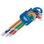 Expert Quality, coloured, long arm, metric ball ended Draper TX - STAR® keys. Manufactured from chrome vanadium steel, hardened, tempered and chrome plated with a protective coloured rubber coating. Each colour signifies a different size. Supplied in fold - out easy release holder.