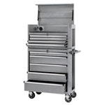Expert Quality, nine drawers metallic silver combined roller cabinet and tool chest. Attached with braked and swivelling castors and soft grip pulling handles for easy manoeuvrability. The reinforced lid is fitted with supportive gas struts andacable access hole.Manufactured from thick sheet steel with a protective powder coated finish. Drawers are fitted with Aluminium trim, 3mm EVA foam linings, secure locking system with two keys and auto retention ball bearing runners delivering smoother operation. Each tool cabinet is also Supplied with an EVA top mat. Carton packed on a pallet.