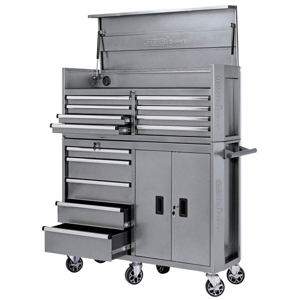 Expert Quality, thirteen drawers metallic silver combined roller cabinet and tool chest. Attached with braked and swivelling castors and soft grip pulling handles for easy manoeuvrability. The reinforced lid is fitted with supportive gas struts anda cable access hole. Manufactured from thick sheet steel with a protective powder coated finish. Drawers are fitted with Aluminium trim, 3mm EVA foam linings, secure locking system with two keys and auto retention ball bearing runners delivering smoother operation. Each tool cabinet is also Supplied with an EVA top mat. Carton packed on a pallet.