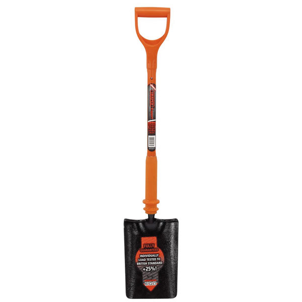 Expert Quality, fully insulated trenching mouth shovel designed for working near live cable and wires. Individually tested to 10,000 volts, guaranteeing safe working on 1,000V and complying to the BS 8020 standards. Manufactured with an epoxy fibreglass core and attached to a fully enclosed insulated shaft with hand slip guard. Each shovel is supplied with a certificate of conformity, which correlates with a unique traceability number embossed on the shaft. Sold loose.