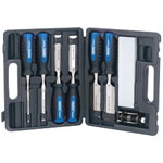 An expert quality chisel set comprising six chisels (blade widths: 6, 12, 20, 26, 32 and 38mm), honing guide and an aluminium oxide sharpening stone.