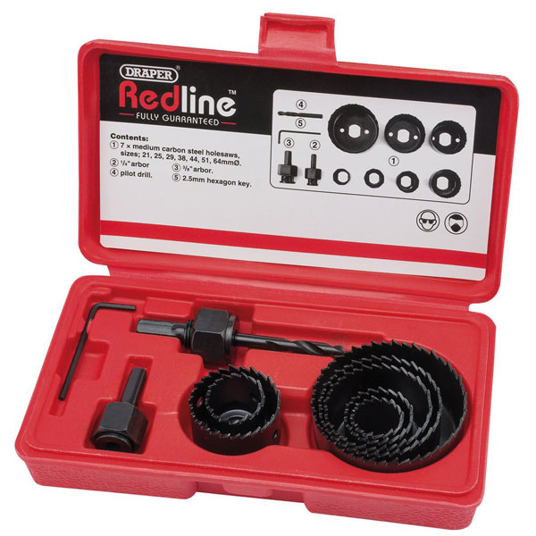• 7 x holesaw blades: 21, 25, 29, 38, 44, 51, 64mm diameter