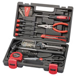 Featuring screwdrivers, long nose pliers, adjustable wrench, hammer and measuring tape.