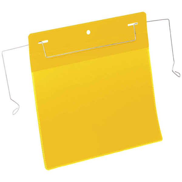 Durable's wire label holder, model 175204, is a yellow A5 landscape identification pocket measuring 210 mm by 148 mm. It features a transparent pocket with a wire holder, ideal for container identification in logistics. Typically used for bearing identification, it comes in a pack of 50 pieces.