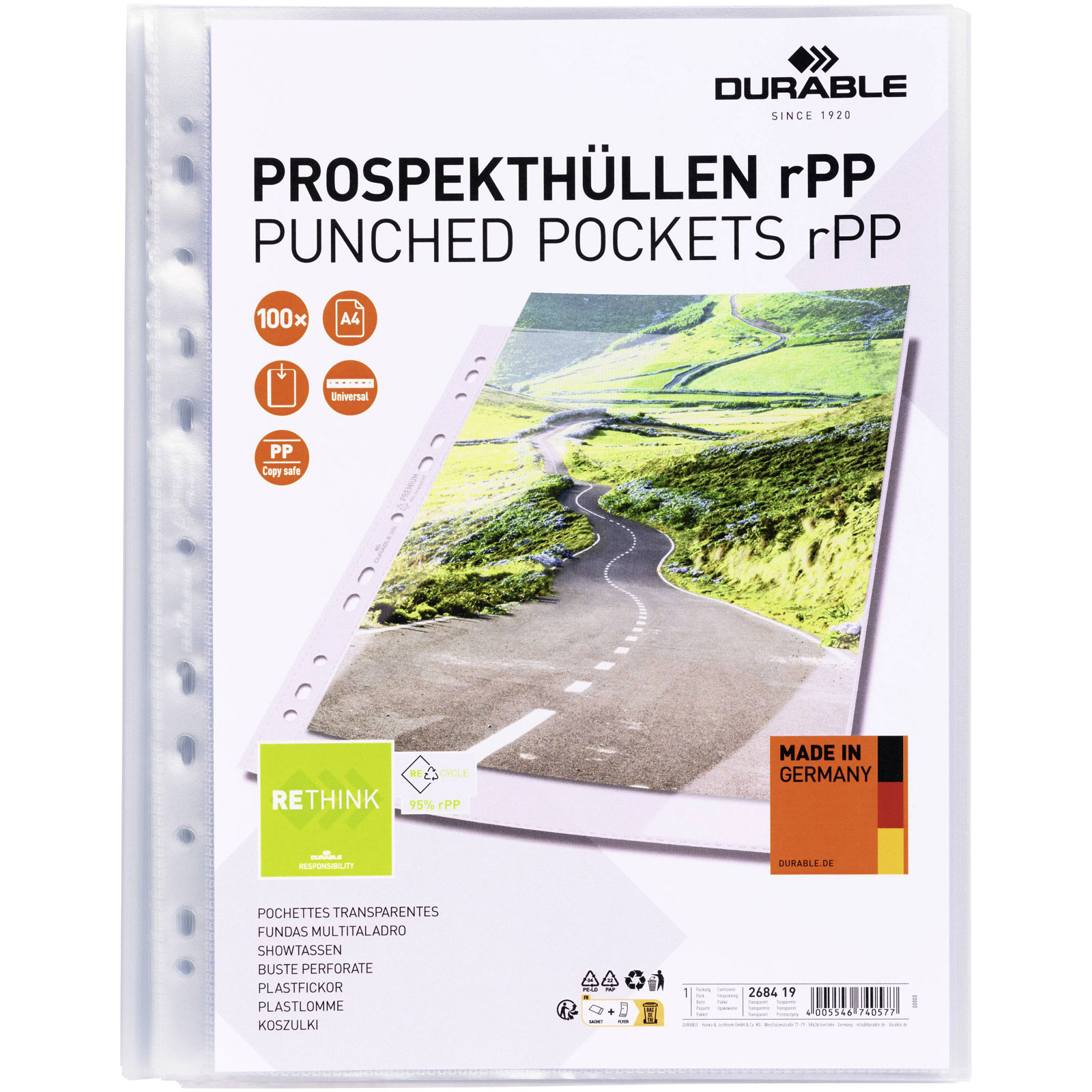 Durable 268419 Punched pocket Transparent Recycled plastic 100 pcs A4 sleeves
