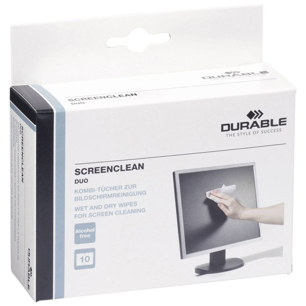 The Durable SCREENCLEAN DUO 572102 is a screen cleaning kit that includes ten damp cloths. These cloths are designed to effectively clean displays, monitors, and laptop screens. Ideal for maintaining clarity and reducing smudges, this kit is perfect for both personal and professional use on a variety of electronic devices.