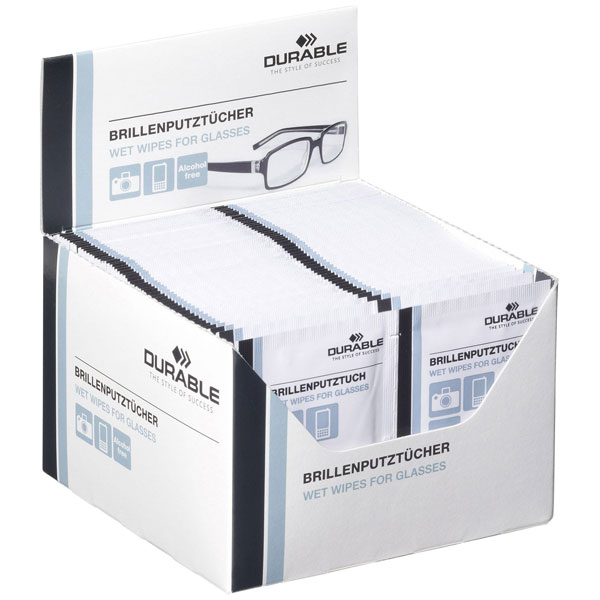 The Durable lens wipes are designed for cleaning glasses and other optical devices. Each box contains 100 individually wrapped wipes that efficiently remove smudges and dirt. These wipes are perfect for maintaining the clarity of cameras, lenses, and eyewear.