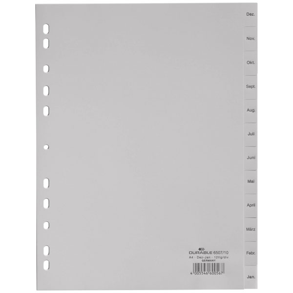 Durable 1711298 presents the 650710 index A4 dividers, designed specifically for organisational efficiency in both office and engineering environments. These dividers are crafted from high-quality polypropylene, offering a robust construction resistant to wear and tear, ideal for frequent handling in technical settings. The product comprises 12 embossed tabs, each clearly marked, facilitating straightforward categorisation and retrieval of documents typically needed in mechanical design projects, project management documentation, or technical specification files. Featuring a grey colour scheme, the A4 size dividers provide a professional look while ensuring compatibility with standard UK binders, thus supporting orderly document management across various industrial applications. The design ensures that these dividers are perfect for chronological or alphabetical document separation in settings where precision and durability are paramount.
