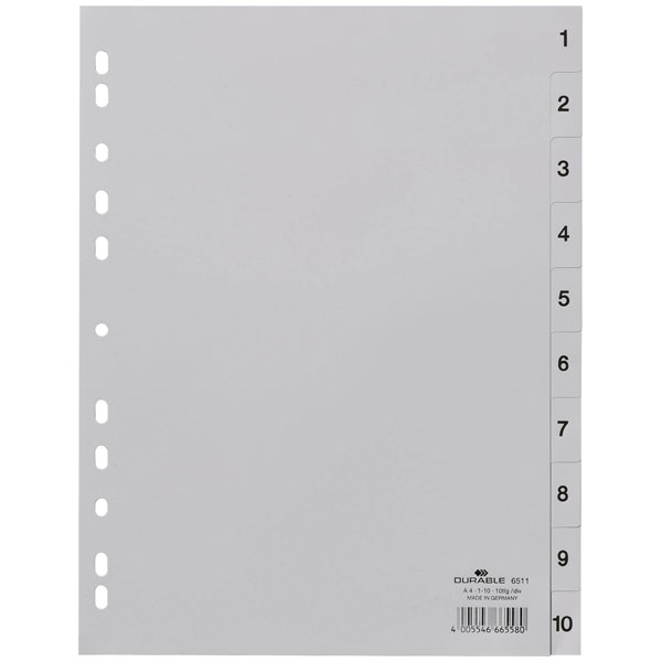 Durable 651110, also known as Durable 6511 Index A4, is engineered as a set of dividers fabricated from high-quality polypropylene in a grey hue. Each set includes ten embossed tabs, numbered from 1 to 10, to facilitate the systematic organisation and categorisation of documents within an A4 binder format. The durable construction of the polypropylene material ensures longevity and resistance to wear and tear, making the dividers suitable for frequent handling in office and industrial environments where precise documentation organisation is essential. Common applications include use in technical documentation storage, project management files, and within engineering departments for structuring reports and manuals.
