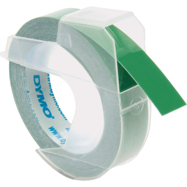 Green 9mm tape for use in DYMO embossing-type label printers.