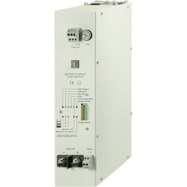 The EA Elektro-Automatik EA-BC 812-60R is a state-of-the-art microprocessor controlled battery charger. They optimise battery life by using a 3-stage charging process for a complete, rapid charging cycle. The chargers in the EA-BC 800 R series can be used to charge lead acid batteries with liquid, gel (Gel Cell) or felt soaked (AGM) electrolyte. If the charger is connected to the battery with the polarity reversed or if the battery is completely discharged (<0.2 x Unom.) charging will not start. Low discharge batteries (>0.2 to <0.9 x Unom.) start with a reduced current precharge cycle. This is followed by a cycle, at full voltage and maximum current until the charging current sinks below 80% of the nominal output current. The third stage is a trickle charge cycle which keeps the total charge in the battery is constant to prevent self-discharge.