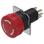 The EAO Series 51 features a latched stop switch actuator which has a plastic housing and red mushroom head switch. This stop switch is IP65 rated and has a switching rating of 250V @ 5A.