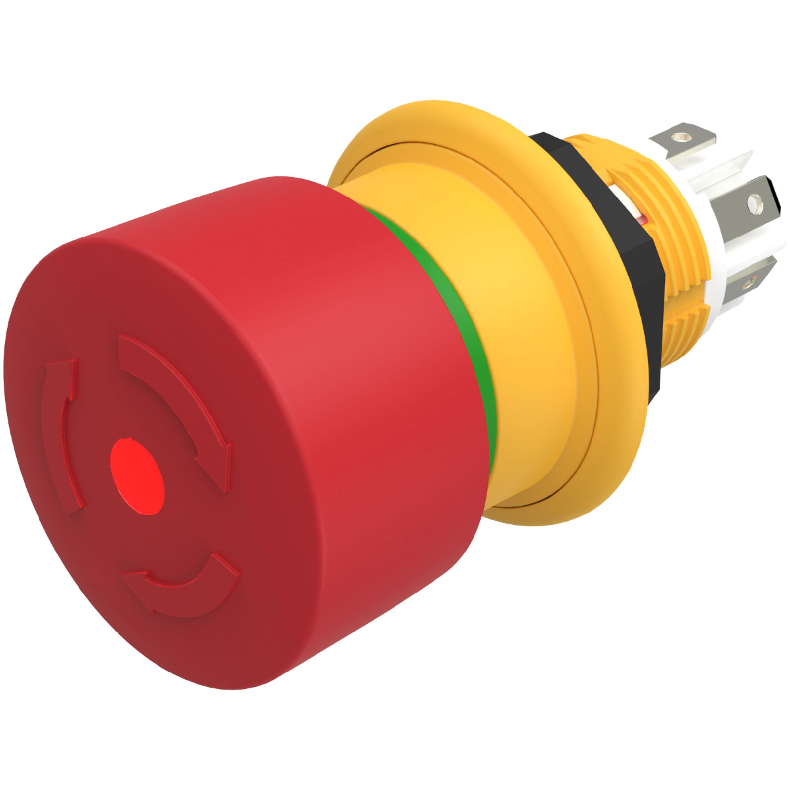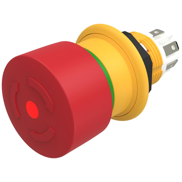 The EAO Series 61 features an illuminated red emergency stop mushroom head actuator, with green indicator in yellow plastic housing, with twist to release functionality.