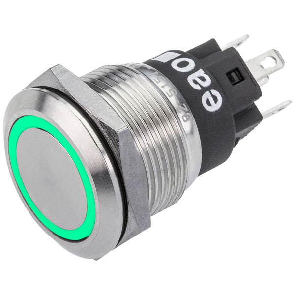 The EAO Series 82 features a green illuminated stainless steel, momentary 19mm flush push button. This push button is IP65|IP67 rated and has an operating voltage of 12V AC/DC.