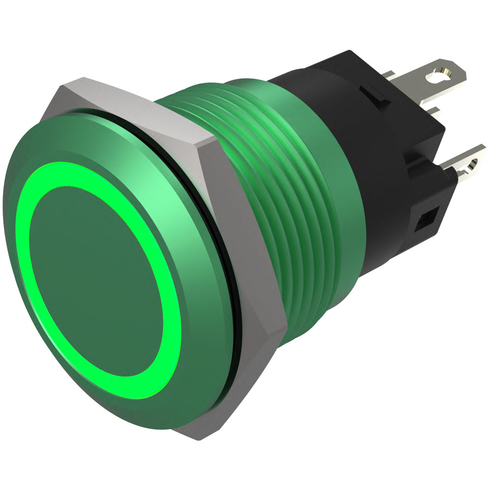 EAO Illuminated Momentary 19mm Green Flush 24V Solder Terminals - manufacturers part number 82-5851.1134.1287. EAO push button switches control the action in a piece of machinery or a particular process. Commonly used within the workplace and home, push button switches are usually constructed from metal or plastic, which should be a consideration when you are choosing a product for your specific application.