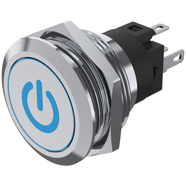 The EAO Series 82 features a blue illuminated stainless steel, momentary 25mm flush push button with standby/power symbol. This push button has an operating voltage of 24V DC, and has a 22mm cutout diameter.