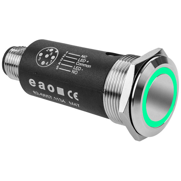The EAO Series 82 features a 316L stainless steel, maintained 22mm flush push button with green LED illumination. This push button is IP65|IP67 rated and has a 5 pin M12 type connector.
