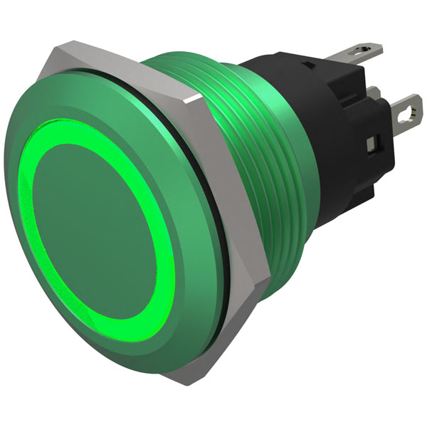 EAO Illuminated 22mm Green Flush Green 24V Solder Terminals - manufacturers part number 82-6851.1134.1294. EAO push button switches control the action in a piece of machinery or a particular process. Commonly used within the workplace and home, push button switches are usually constructed from metal or plastic, which should be a consideration when you are choosing a product for your specific application.