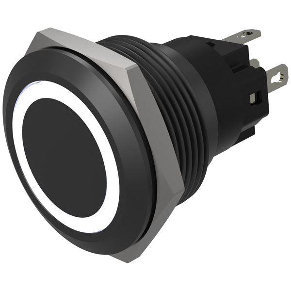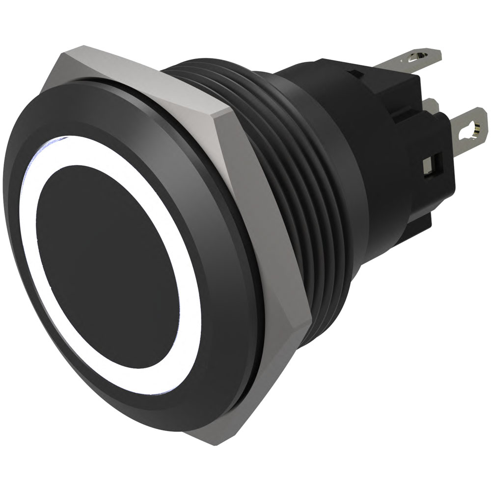 EAO Illuminated 22mm Black Flush White 24V Solder Terminals - manufacturers part number 82-6951.1154.1309. EAO push button switches control the action in a piece of machinery or a particular process. Commonly used within the workplace and home, push button switches are usually constructed from metal or plastic, which should be a consideration when you are choosing a product for your specific application.