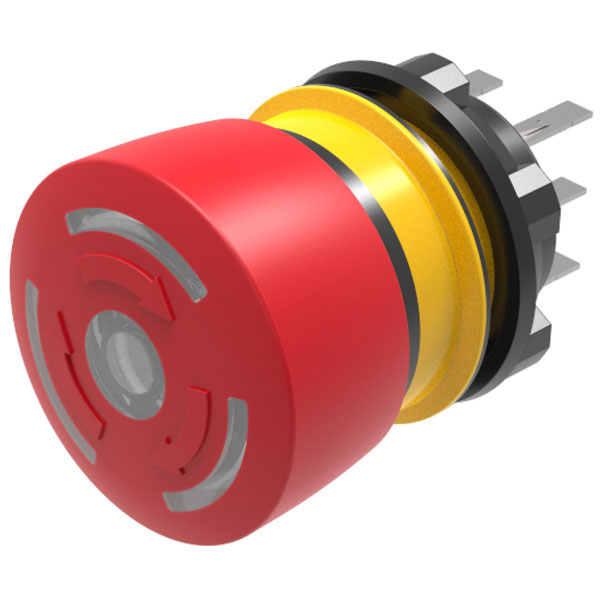 The switch features an Illuminated, Red, emergency stop mushroom head actuator with a black and Yellow plastic housing with plug-in terminal connection. The Yellow part of the housing features a Green position indication ring, visible when the pushbutton is in the normal (deactivated) position and obscured from view when the pushbutton is pressed (activated).
