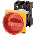 This 3-pole emergency isolator switch from EATON is lockable in the O (off) position. It has a red rotary handle and yellow locking ring.