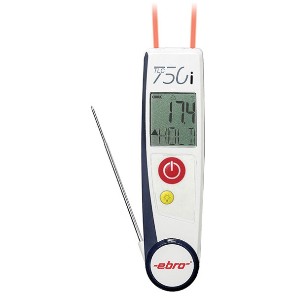 The ebro TLC 750i-V2 is a versatile thermometer combining contact measurement with non-contact IR reading. It operates within a range of -50 to +250 °C and complies with HACCP standards. This device is ideal for ensuring food safety compliance in catering and food production environments.