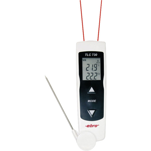 The ebro TLC 730 is a Dual-Infrared/ Fold-Back-Thermometer with a Foldable Penetration Probe and Infrared Sensor. It is both an infrared as well as contact thermometer. You can choose between these two measuring methods at any time. When using the thermometer in infrared mode, there are two integrated laser pointers to help target the desired measuring surface.