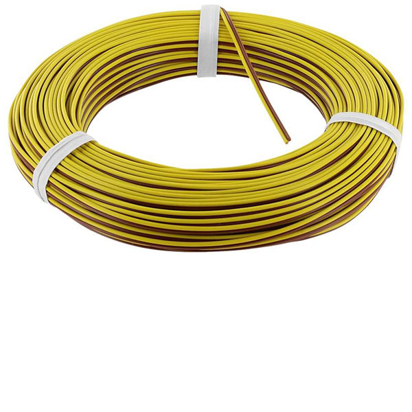 The econ connect ZKL014GEBR50 Strand is a wiring braid with a cross-section of 2 x 0.14 mm² and comes in yellow and brown colours, with a length of 50 metres. It is designed for low voltage applications, typically used in internal switchboard and feeder wiring. This product is ideal for precise electrical connections within electronic devices or control panels.