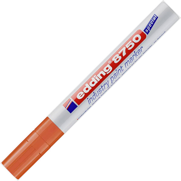 Edding 4-8750006 is a paint marker designed for precise and durable marking applications. This marker features an orange ink that is ideal for creating vibrant, eye-catching markings. It has a versatile bullet tip that allows for line widths ranging from 2 mm to 4 mm, catering to various precision requirements. Constructed for reliability, it is suitable for diverse engineering applications, including marking on metal, plastic, glass, and other non-porous surfaces where durable inscriptions are essential. The Edding 8750 marker is particularly valuable in technical settings where clear, long-lasting identification is crucial.