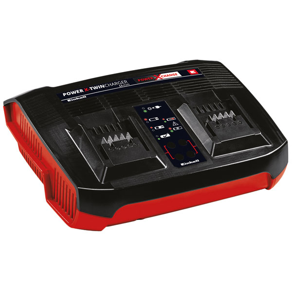 The Einhell PXC Power-X Twincharger charges two 18V Li-ion batteries at the same time and can be used universally for all 18V Power X-Change batteries. Intelligent charging management provides maximum safety and optimum charging. Charging cycles are adjusted to the specific situation, so the batteries have a longer service life. The 6-stage charging system provides the user with up-to-the-moment battery status information. Integrated suspension eyelets for easy wall mounting.