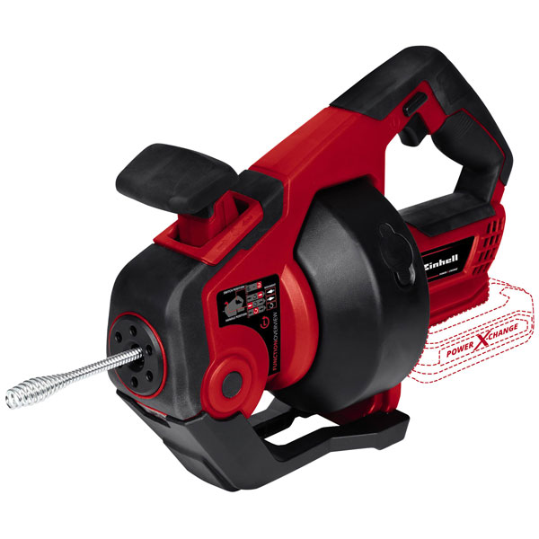 The Einhell TE-DA 18/760 Li Solo Drain Cleaner with a durable zinc coated coil and sprial that won't rust. Entering and exiting the pipe is easy thanks to the powered feed and results in a neat and tidy cleaning solution. The direction of rotation can be reversed for clearing even major blockages. For user-friendly cleaning the drum has an inlet, outlet and locking mechanism. An LED illuminates the work area. Its ergonomic design and soft grip result in exceptionally easy handling.