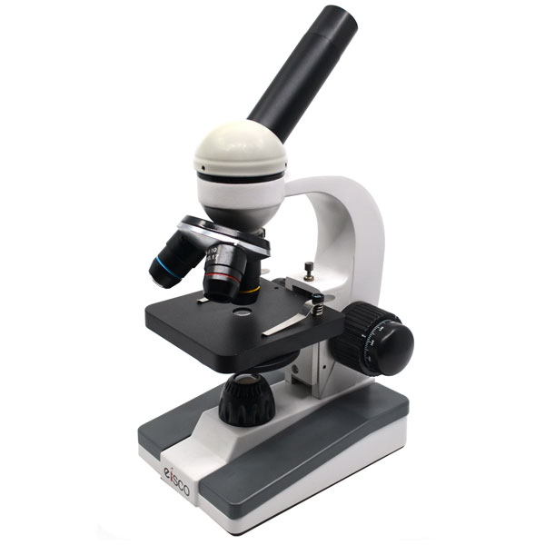 EISCO BI0009B Monocular Microscope, Prime LED 101, 4X, 10X, 40X Objectives This monocular compound microscope is an excellent choice for home/educational use, and is designed for primary to high school grade levels. With an adjustable LED illumination system, the coaxial focusing mechanism allows for simple fine and coarse adjustment. It has a rotating disc type diaphragm with five sizes for adjusting light transmission . The 10XWF eyepiece features a pointer and sits at 45 degrees on the 360 degree rotating monocular head. A revolving nosepiece allows slides to be viewed through 4X, 10X & 40X objectives. The 3.75x3.75" stage is equipped with stage clips to prevent slide movement and a pre-set rack stop to prevent damage to objectives.