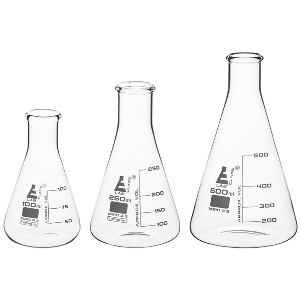 EISCO CH196032 Premium Erlenmeyer Flask Set, N Neck, Borosilicate 3.3 Glass is a three piece Erlenmeyer Flask set made of high quality, heavy duty, borosilicate 3.3 glass. It includes three narrow neck flasks with 100ml, 250ml & 500ml capacities. The flasks feature white printed graduations, and beaded rims with uniform thick walls which provide excellent strength against breakage. The set is packaged in a custom fit, thick foam casing, for safe storage and worry free transport.