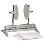 This demonstration capacitor consists of two 120mm circular metal discs mounted on insulated supports that slide on a track to adjust the distance between them. The distance can be easily measured by reading their respective positions on the fixed scale.