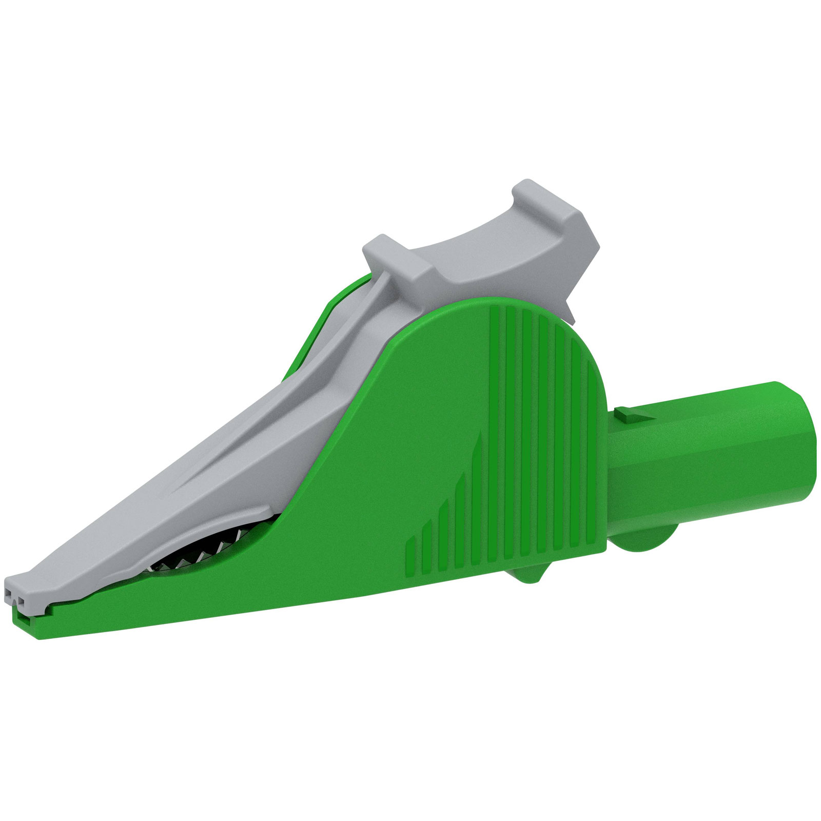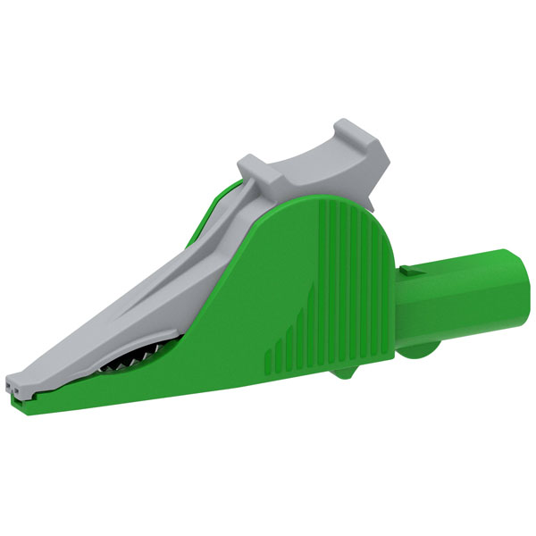 The Electro PJP 5066-IEC-CD1-V alligator clip features a 4 mm jack connector suitable for CAT III 1000 V and CAT IV 600 V applications, ensuring safety and reliability in high-voltage environments. This green crocodile clip is ideal for testing and measurement tasks in electronics and electrical work. Its robust design allows for secure connections during diagnostics and maintenance procedures.