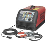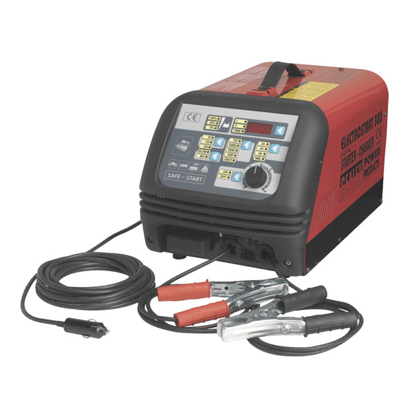 Fully electronic, microprocessor controlled battery starter/charger designed to meet the requirements of modern battery technology. � Powerful and �intelligent� charging and boost starting from heavy-duty transformers. � Suitable for Gel, Lead Acid, Lead Calcium, Ni-Cad and Silver Calcium batteries.� Instant visual check of battery condition, charge current, voltage and charging rate on LED read-out.� Instant control of power delivery prevents polarity reversal by cutting output power - no fuses to blow and no trips to reset. � Stabilised charging current allows improved charging efficiency and reduced charging times using Intellicharge circuitry. � Fitted with standby feature - provides stabilised power to vehicle�s electronic circuits through accessory socket enabling battery to be disconnected.� Includes circuitry to provide surge and spike protection during charging and starting thus preventing damage to vital systems such as ABS, airbag sensors, ignition and music systems.� Turbo-Fan cooled, heavy-duty transformer. Suitable for a wide range of vehicles - depending on model selected.� Wipe-clean touch-sensitive control panel.