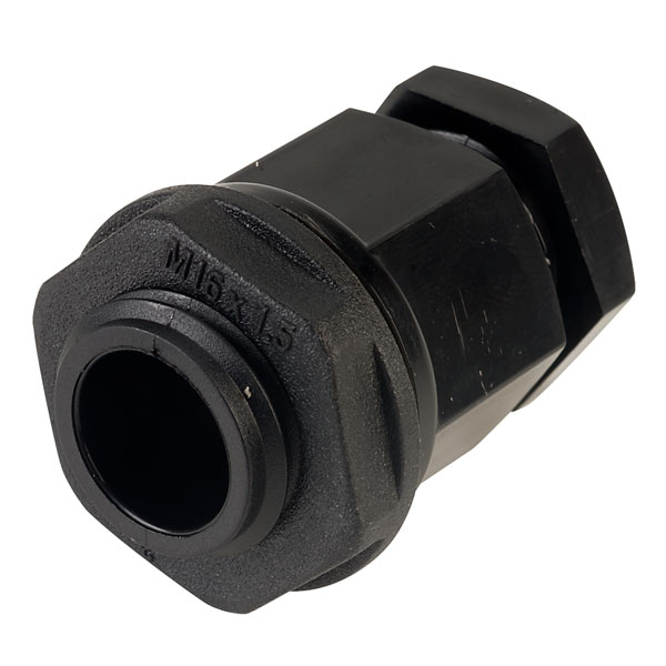 Compression M16 cable glands from Elkay moulded in black Nylon 6.6 and supplied with lock nut and soft nylon washer.