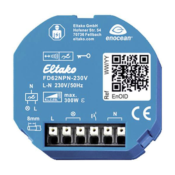 Eltako FD62NPN-230V dimmer actuator, model number 30100535, is designed for flush mounting applications. This dimmer actuator allows for precise lighting control, making it ideal for residential or commercial settings. It's built to handle varying lighting needs, enhancing ambience and energy efficiency.