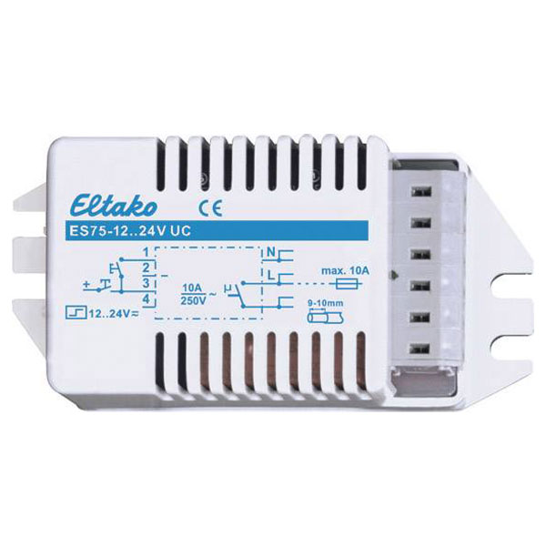 The Eltako ES75-12..24V UC is a remote impulse changeover switch designed for managing electrical load changes. It features surge protection, making it ideal for use in systems requiring reliable load switching. Common applications include use in lighting control and automation systems.